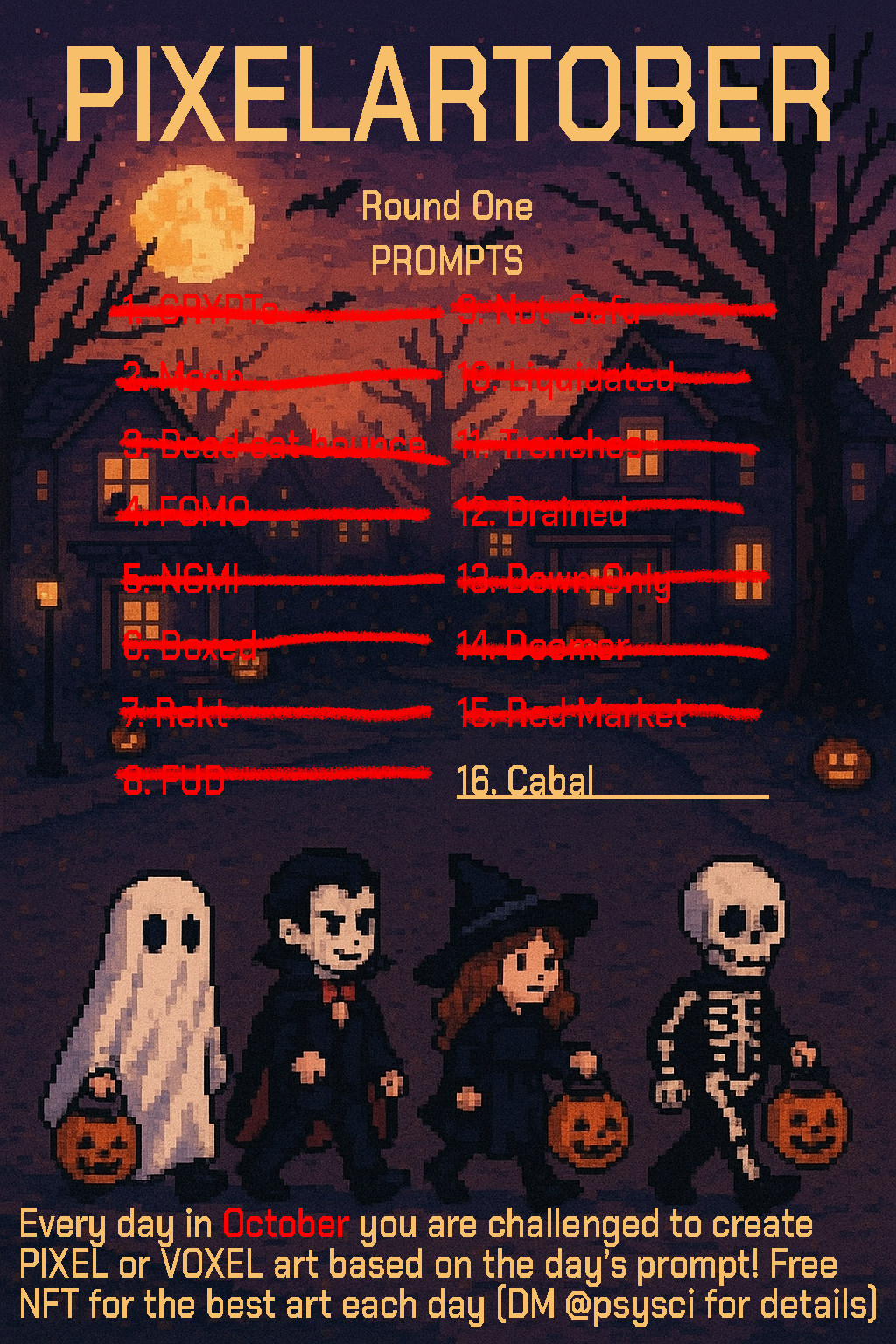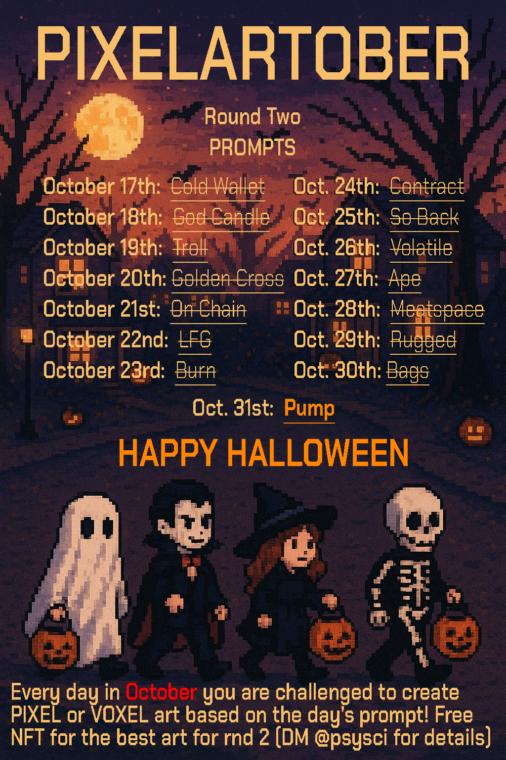 Every day in October you are challenged to create PIXEL or VOXEL art based on the day’s prompt! Free NFT for the best art each day (DM @psysci for details)